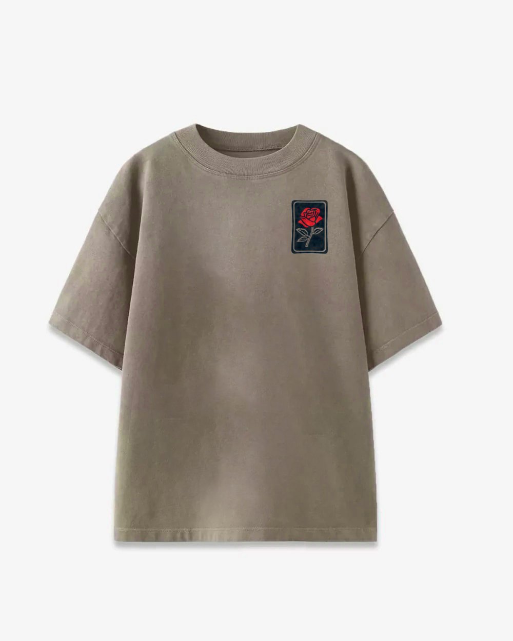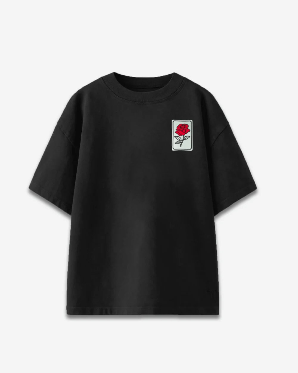 Crafted from 100% cotton French terry, in jet BLACK and BURLLYWOOD KHAAKI colour. This drop-shoulder baggy streetwear t-shirt with a substantial 240 gsm fabric weight. Front is blooming with lovely Rose patch style vinyl. Back of the t shirt is printed in illustrious design makin it a unique back printed t shirt.
