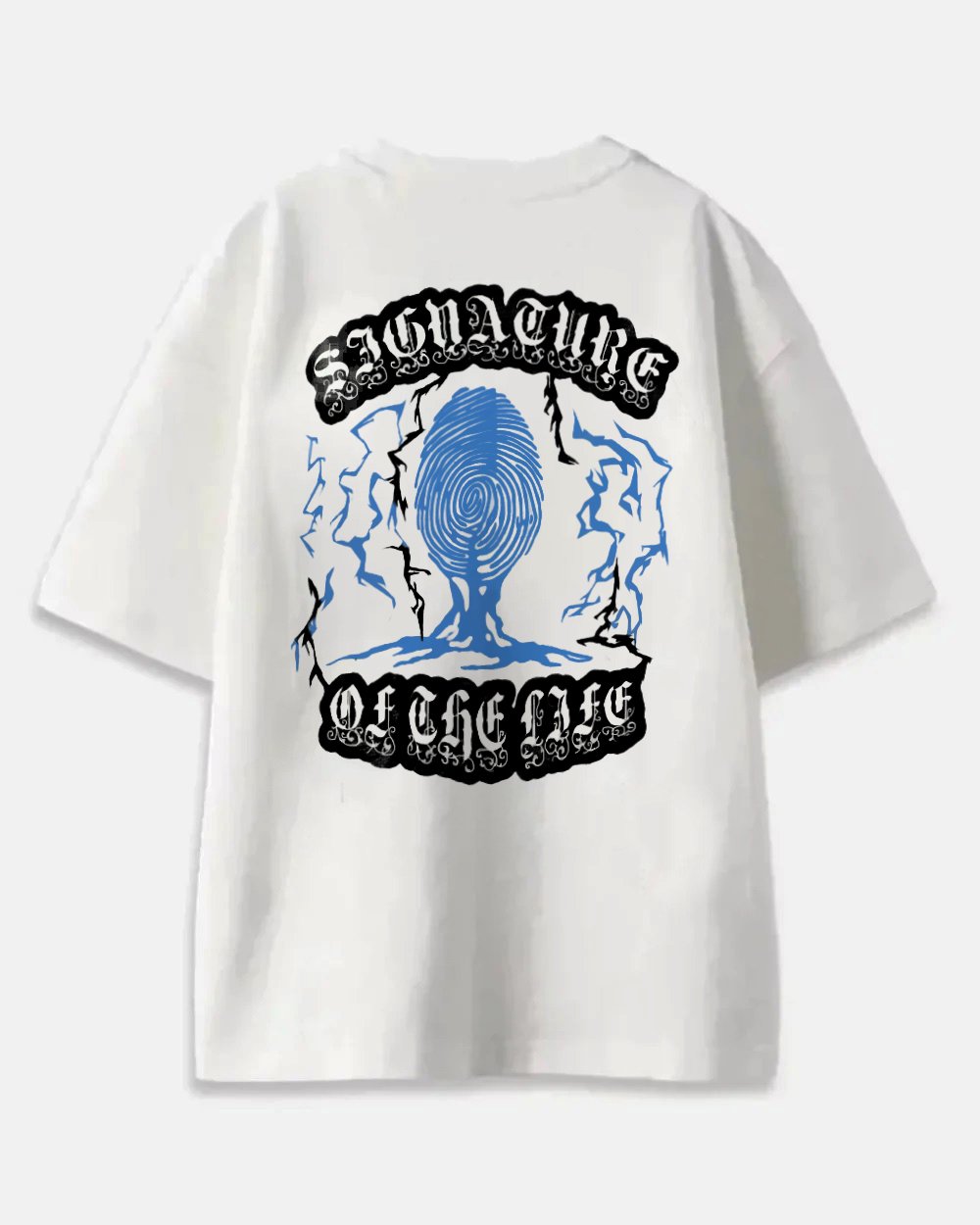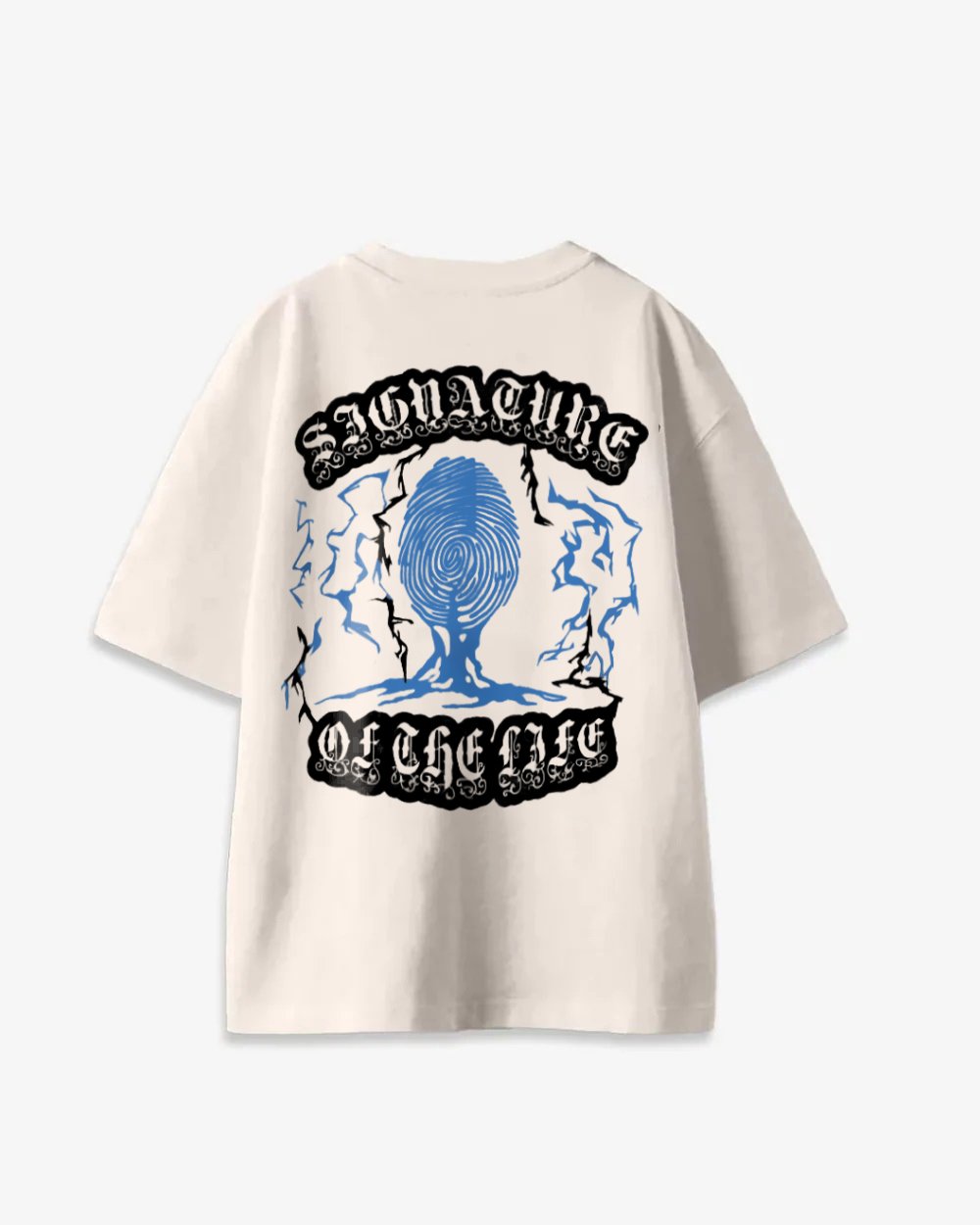 Its a unique drip, expressing life. On the front it’s beige t-shirt featuring a graphic design of nine distinct tree icons, each varying in shape and style symbolising various phases and nature of life. On the back there is Signature of the Elite Design featuring a large blue fingerprint that forms the trunk and branches of a tree in the center of the image. Surrounding the tree are jagged blue and white lightning bolt-like lines, creating an AURA OF ENERGY. “Signature” is written in a bold, gothic font with dark, swirling designs. Below the tree, the phrase “Of the Elite” is displayed in the same stylized font, completing the dramatic and artistic motive.
