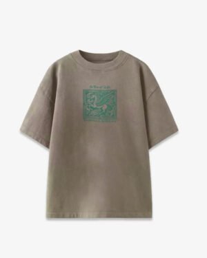 T shirt specifications- Crafted from 100% cotton French terry, in ecstatic BURLEYWOOD KHAKI and VINTAGE BLUE colour. This drop-shoulder baggy streetwear t-shirt with a substantial 240 gsm fabric weight. Squarish HD rubber embossed print giving unique subtle streetwear look. The square frame surrounding the pegasus is elaborately ornamented with swirling patterns, decorative flourishes, and stylized waves, adding to the design’s intricate and ornate feel.